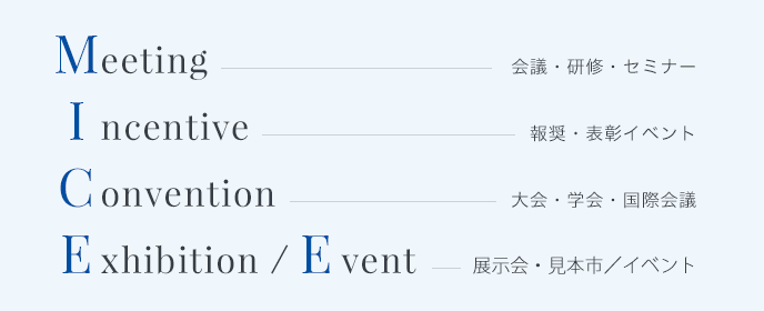 MICEとはMeeting(会議・研修・セミナー)、Incentive(報奨・表彰イベント)、Convention(大会・学会・国際会議)、Exhibition(展示会・見本市)/Event(イベント)の頭文字をとった造語で、これらビジネスイベントの総称です。